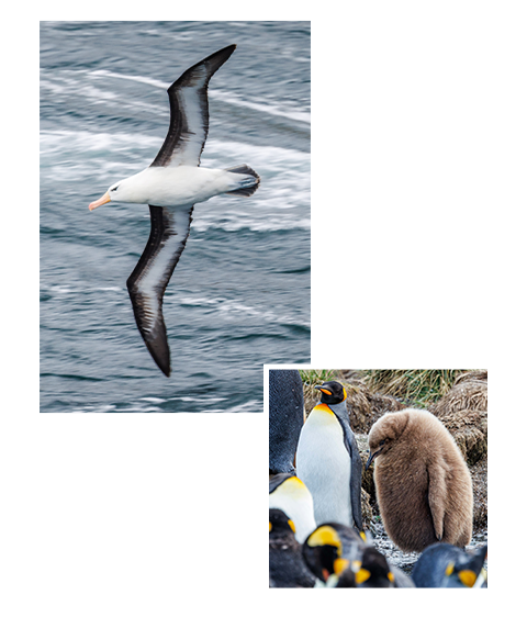 提供豐富的野生動物觀察機會,包括各種 企鵝、海豹和海鳥,特別是大量國王企鵝 聞名的南喬治亞島,多樣性的生態系統是 單純南極半島航程中無法獲得的。