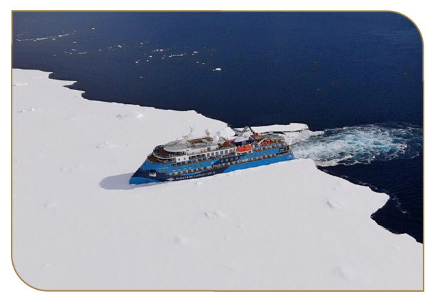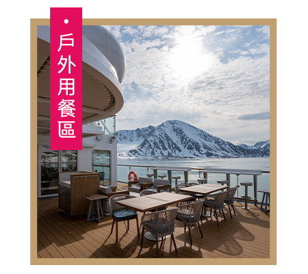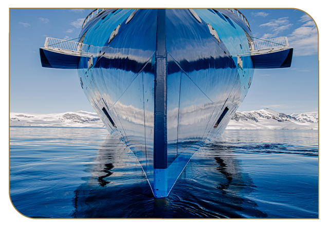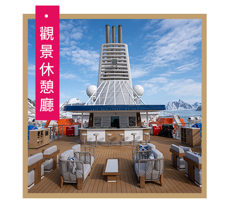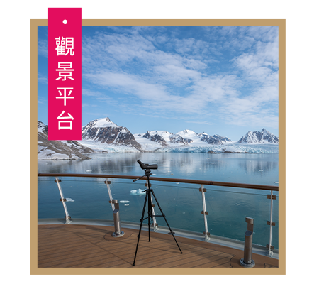 突出於船外的廣闊視野,能夠更好、更近 距離的欣賞冰山、鳥類和鯨魚,在令人讚 嘆的自然美景中創造值得留下的回憶!