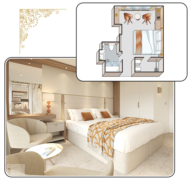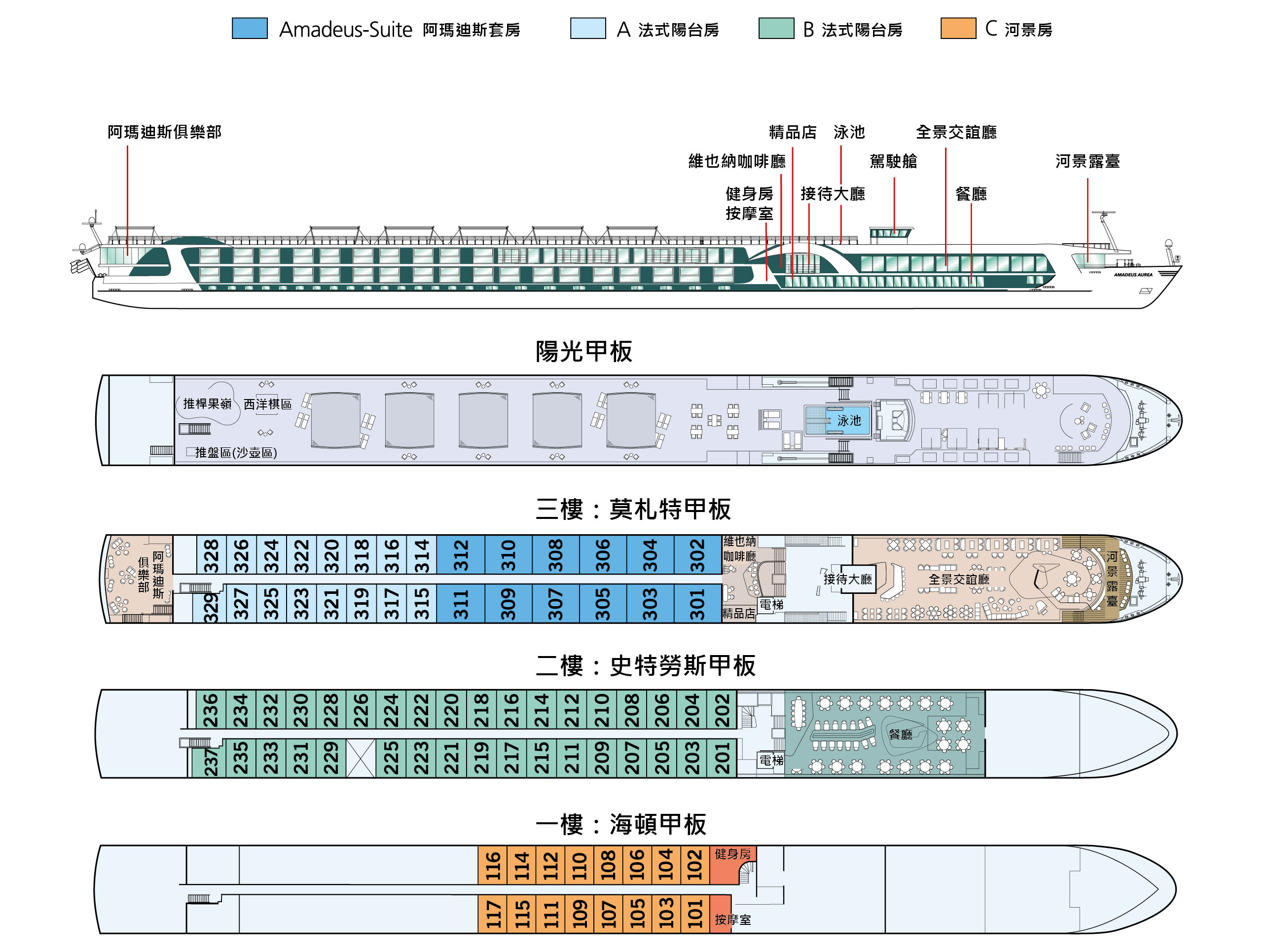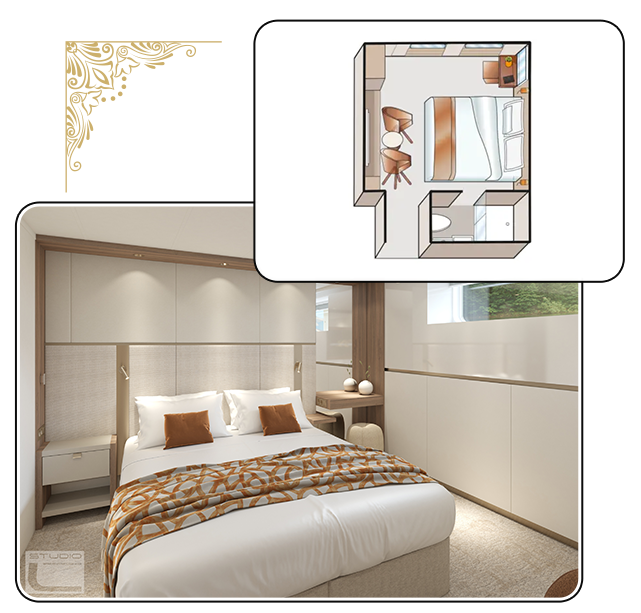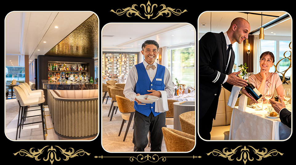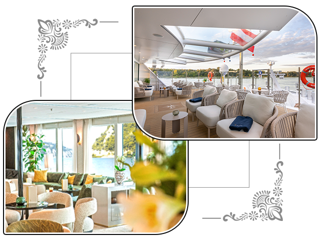 AMADEUS Aurea 承襲 AMADEUS 系列經典設計,將現代簡約與傳統優雅巧妙融合於船身與內裝。空間規劃合理,既保留舒適感,也提供多樣化餐飲選擇。材質、光線、動線皆經細緻考量,呈現對精緻生活的理解。AMADEUS Aurea 不只是河上航行,更是一種生活方式:以創新設計與周到規劃,讓每段航程自然流暢,充滿品味。