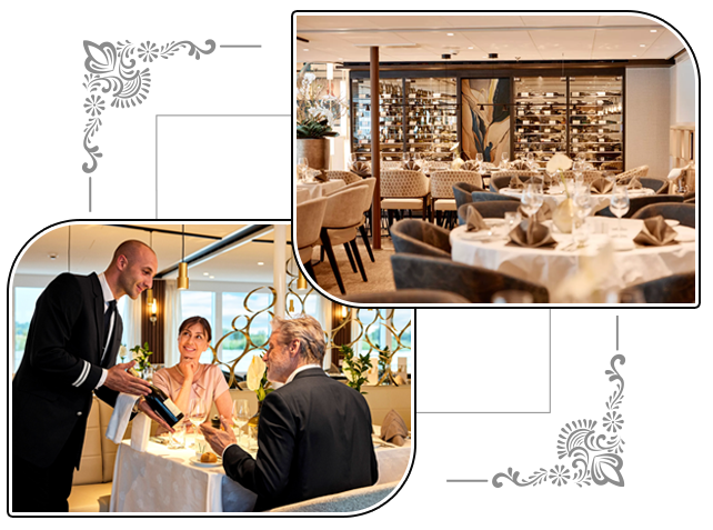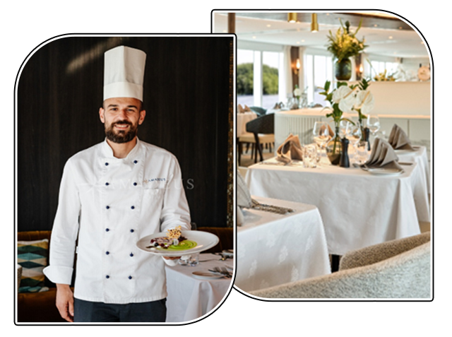 2樓|史特勞斯甲板 於全景餐廳品味河上時光,格調雅緻的全 景餐廳中,用餐不只是進食,而是一段專 屬於河上的節奏。主廚以當季食材呈現細 緻料理,窗外流動的河岸風景同步展開, 讓每一餐都成為旅程中靜心而專注的片刻。