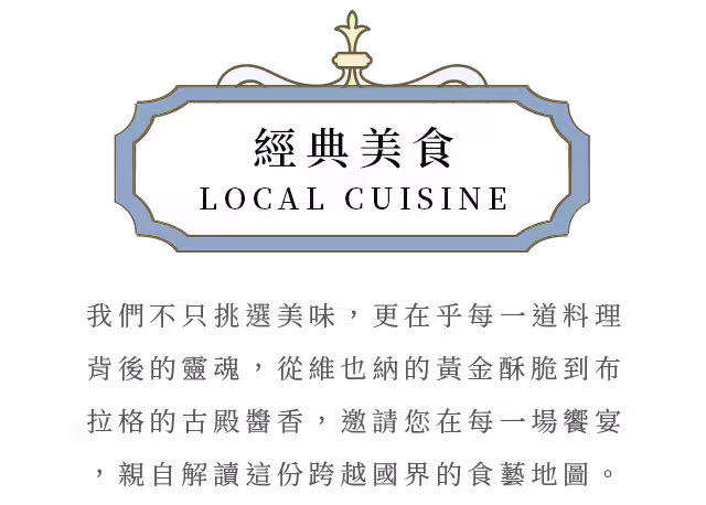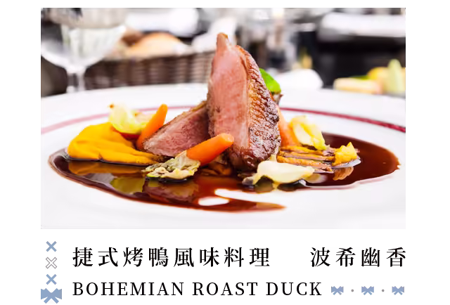 在布拉格百年藝術殿堂中,品味慢火秘 製的香甜肋排,軟嫩骨肉在優雅的環境 中化為奢華的味覺體驗,將歷史的優雅 融入濃郁醬香,譜寫跨越時空的經典。