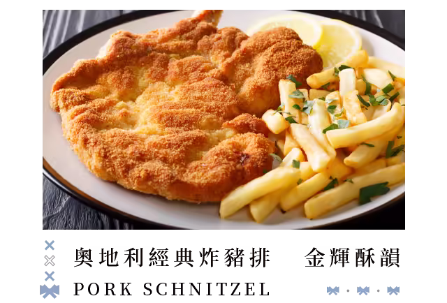 承襲維也納百年配方,將鮮嫩肉質裹上 如金箔般的酥脆外衣,每一口都是清脆 與柔嫩的完美交響,也是在舌尖綻放奧 地利最引以為傲的經典風味。