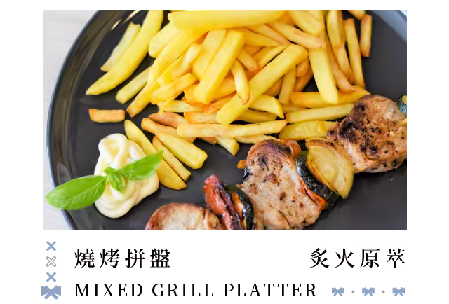嚴選頂級食材經由高溫炙烤,鎖住最純 粹的肉汁原味,火候洗禮後的焦香微韻 ,展現粗獷而細膩的豪邁風情,同時也 是一場對火候藝術的極致致敬。