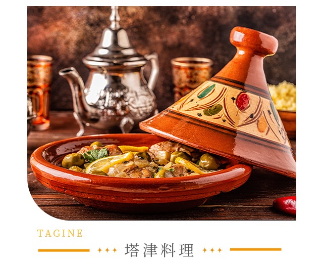 塔津鍋,摩洛哥智慧的特製陶瓷。它能將蔬菜與肉類慢燉鎖鮮,完美保留食材 原汁,品嚐最鮮美的摩洛哥風味。