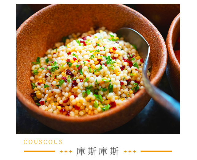 摩洛哥國飯,將粗粒小麥粉用雞汁蒸熟後加上奶油再蒸,充分吸收雞汁奶油後,再 將各式肉類、蔬果、湯汁淋上。