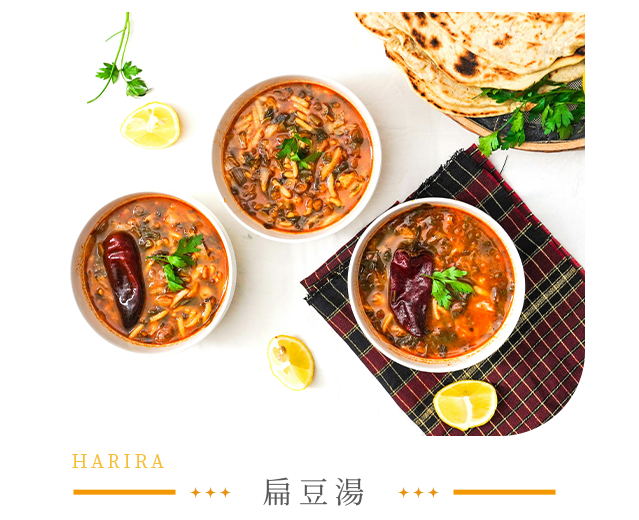 摩洛哥國湯,齋戒月時,每日解除齋戒所食用第一道食物,更是節慶及婚宴的 必備佳餚。