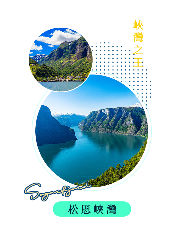被稱為「峽灣之王」,全長約 204 公里,是世界最長最深的峽灣。乘船穿梭,兩岸雪山與森林倒映水中,景色如詩。峽灣小鎮弗拉姆,這裡是鐵路終點站,也是探索峽灣的最佳據點,鎮上設施完善,能進一步體驗湖泊與冰河遺跡的壯麗景觀。