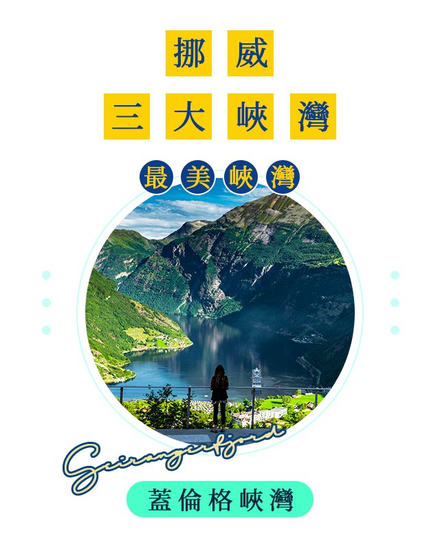 蓋倫格峽灣 Geirangerfjord 世界遺產峽灣,兩岸峭壁、瀑布與古農莊遺址相映成趣。搭乘遊船欣賞七姊妹瀑布、求婚者瀑布,黃金之路沿途蜿蜒峽谷、高山與飛瀑,展現北歐壯麗山水。
