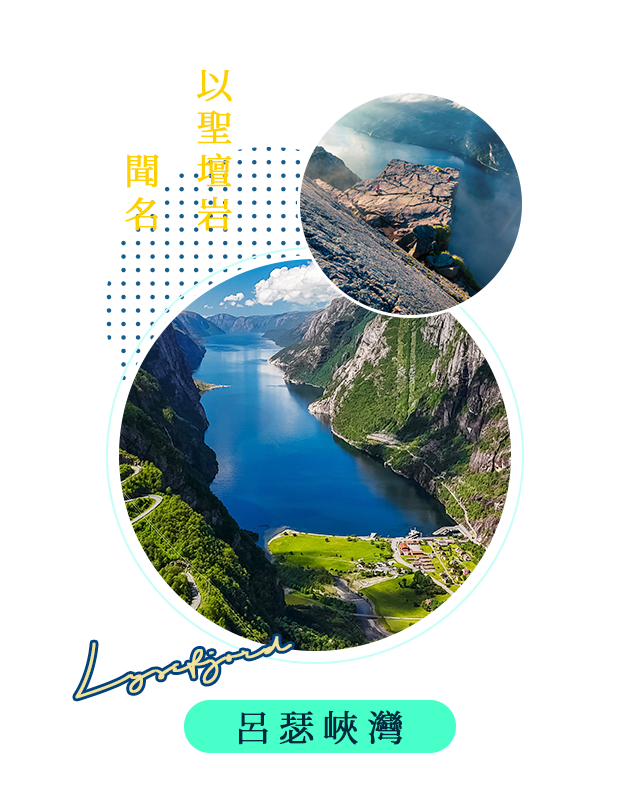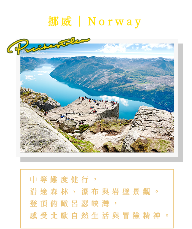 呂瑟峽灣 Lysefjord 長約42公里,峭壁直立、水面平靜。可搭遊船輕鬆欣賞壯麗峽灣,遠眺聖壇岩,體驗北歐峽灣的雄偉與幽靜景致。