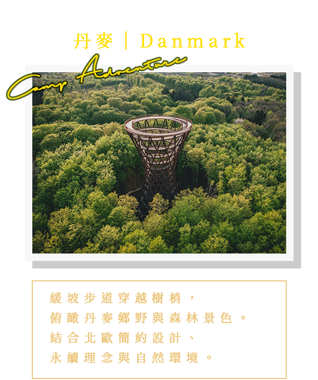 位於哥本哈根南方約一小時車程處,以高達45公尺的螺旋觀景塔聞名,設計靈感源自北歐ssss簡約風格,結合木質結構與森林環境完美融合。遊客沿著緩緩上升的步道穿越樹梢,登上塔頂俯瞰整片森林與遼闊的丹麥鄉野。四季各有風情,是結合自然、設計與永續理念的地標建築。