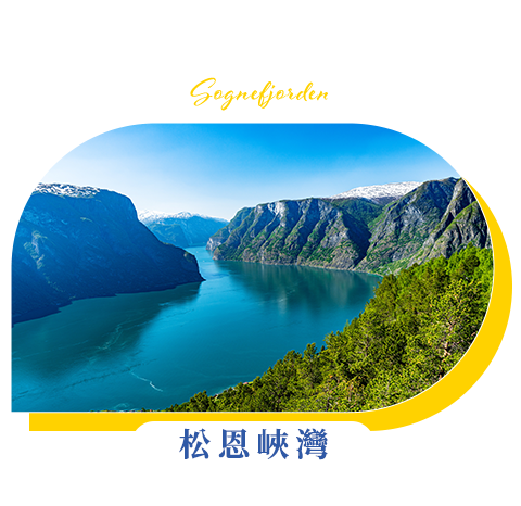 松恩峽灣 Sognefjord 是挪威最長峽灣,碧綠水面倒映雪山與森林。搭船遊峽灣、搭乘佛拉姆縮影觀景火車穿越峽谷與瀑布,短短一小時即可盡覽峽灣與山岳精華。