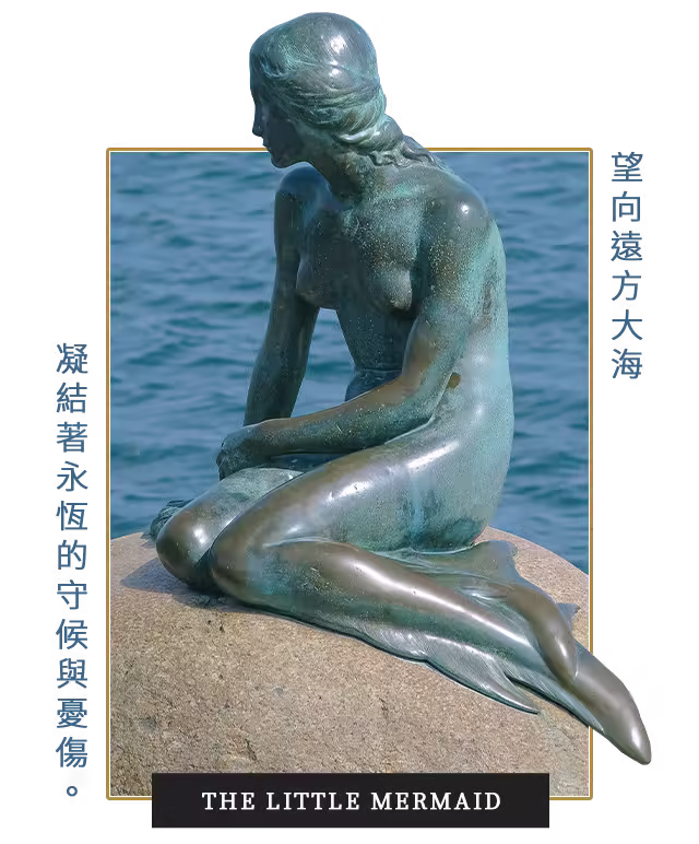哥本哈根象徵性景點,青銅雕像描繪傳說中美人魚,坐落岸邊凝望遠方,充滿神秘浪漫氛圍。此雕像靈感源自世界文學名著《美人魚》,吸引眾多遊客拍照與觀賞。