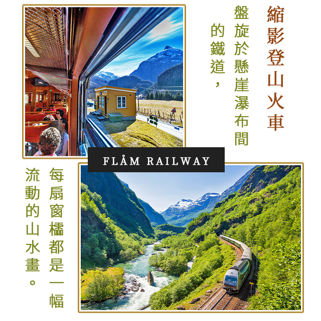 世界最陡的標準軌距鐵路之一。從海拔 866 公尺至僅 2 公尺的弗拉姆,沿途欣賞白雪覆頂的高山、壯觀的飛濂瀑布與幽谷溪流。