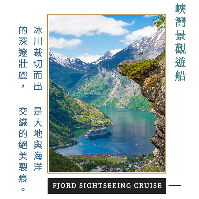 近距離感受峽灣雄偉氣勢,沿途欣賞幽深水道、綠意盎然的村落與散布山腰的農莊,體驗最經典的峽灣風光。