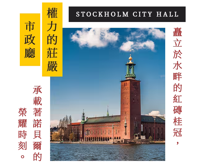 市政廳座落於國王島,以瑞典三皇冠為標誌的高塔聞名。建於1911至1923年間,採用800萬塊紅磚建造。著名的「藍色大廳」每年12月舉辦諾貝爾獎晚宴,「金色大廳」由逾1800萬塊玻璃與黃金碎片砌成,可容納700人宴會。