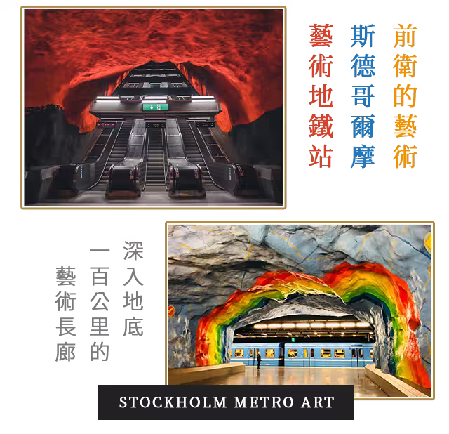 斯德哥爾摩地鐵自1950年開始建設,現已成為世界最具特色的公共藝術畫廊。多數地鐵站裝飾著雕塑、壁畫、裝置藝術與陶瓷作品,藝術家們巧妙融入地下空間,將月台打造為獨特的美術館,帶給旅客驚豔的藝術體驗。