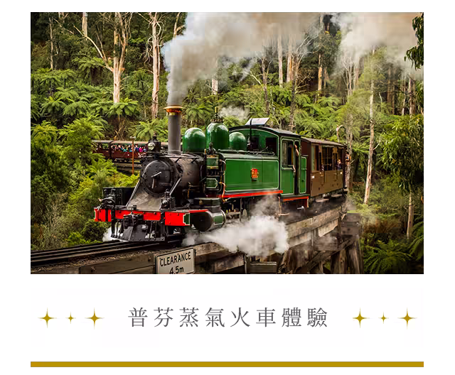 普芬蒸汽火車是一趟穿梭在丹頓農山林間 、澳洲少數可以頭伸出窗外感受森林風景 的百年復古蒸汽鐵道之旅。在冉冉升起的 蒸汽雲霧中,找回最純粹的探險感動。