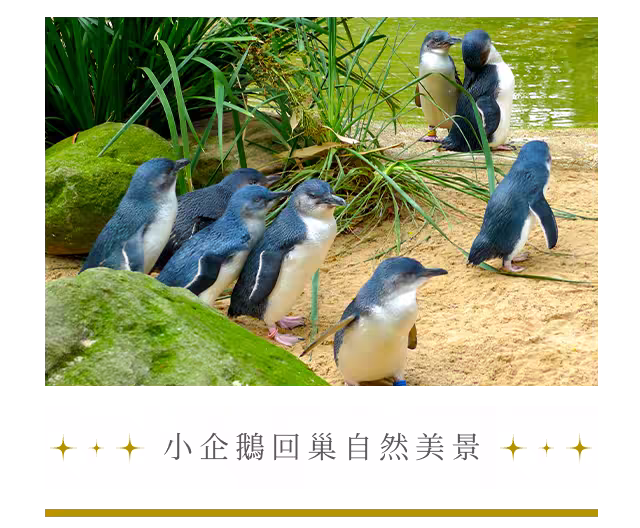 觀賞澳洲神仙企鵝在黃昏中踏沙歸巢,這 群嬌小可愛的澳洲神仙企鵝,帶著藍黑色 的光澤結束一天巡航,踏著蹣跚而有趣的 步伐穿過沙灘回到岸邊家園。