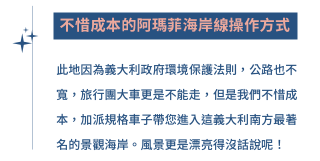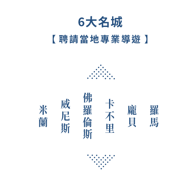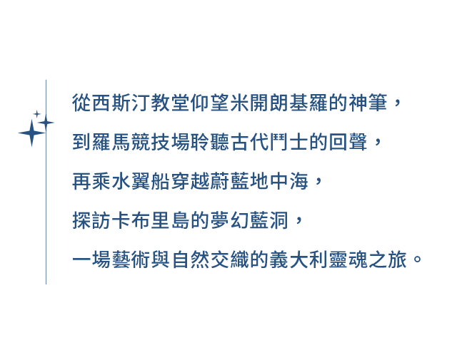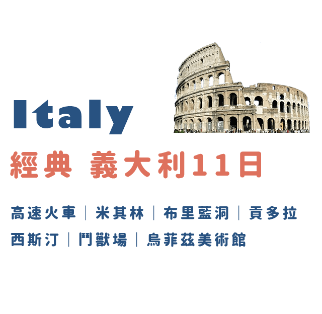 義大利,這個匯聚百年歷史人文的國家;文藝復興的藝術起點,米開朗基羅畫筆下的西斯汀教堂天頂畫以及聖母百花聖殿的穹頂建築等等,讓每個城市蔓延著無處不藝術的美學素養;連街頭巷尾的傳統美食、一杯咖啡都擁有其他國家無法複製的風味與口感。阿瑪菲海岸的海風,摻和著淡淡地檸檬香氣,全世界最美的海岸線成為不可錯過的經典美景;龐貝古城,曾經的帝國榮景,抵不過一夕覆滅的火山噴發,留下1600年的文化孤寂。來到義大利,所到之處何處不經典!