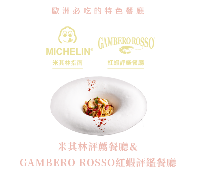 鑑賞美食的起點,既非菜餚本身,也非烹飪手法,首在『食材』!因此我們特別推薦意大利權威餐廳指南Gambero Rosso(Gambero Rosso等同法國的米其林指南)推薦的紅蝦評鑑餐廳,讓您一探美食的世界。Gambero Rosso完整的介紹了義大利這個地方,每個區域、每個省份、每家值得推薦的餐廳、咖啡館、酒吧、橄欖油農莊。也如同米其林一樣,它也有評鑑的表示符號來劃分推薦等級,有卓越蝦、叉子、豆子、酒杯、咖啡杯等形態圖示。