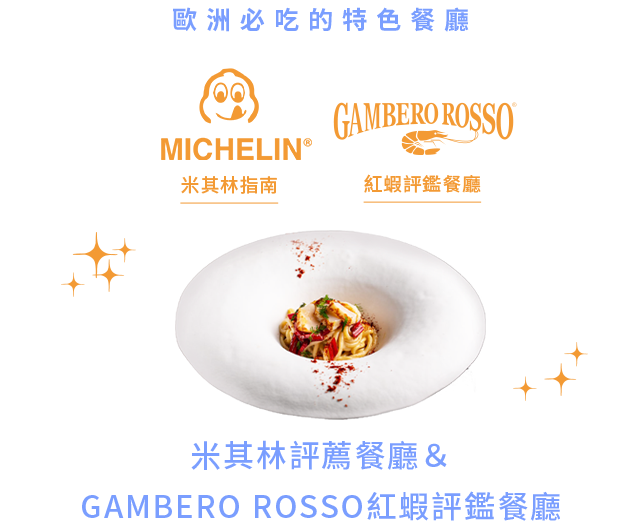 鑑賞美食的起點,既非菜餚本身,也非烹飪手法,首在『食材』!因此我們特別推薦意大利權威餐廳指南Gambero Rosso(Gambero Rosso等同法國的米其林指南)推薦的紅蝦評鑑餐廳,讓您一探美食的世界。Gambero Rosso完整的介紹了義大利這個地方,每個區域、每個省份、每家值得推薦的餐廳、咖啡館、酒吧、橄欖油農莊。也如同米其林一樣,它也有評鑑的表示符號來劃分推薦等級,有卓越蝦、叉子、豆子、酒杯、咖啡杯等形態圖示。