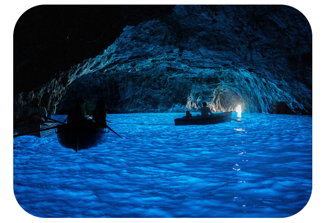 卡布里島Isola Di Capri藍洞(Grotta Azzurra)一向被譽為世界七大奇景之一,洞內清泓翠碧的海水因光線折射,洞內的海水會呈現不可思議的晶藍色,真是讓人身歷其境驚嘆不已!
