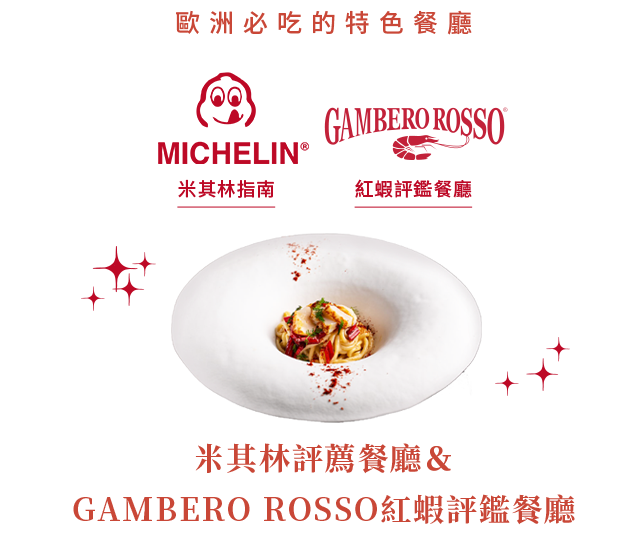 鑑賞美食的起點,既非菜餚本身,也非烹飪手法,首在『食材』!因此我們特別推薦意大利權威餐廳指南Gambero Rosso(Gambero Rosso等同法國的米其林指南)推薦的紅蝦評鑑餐廳,讓您一探美食的世界。Gambero Rosso完整的介紹了義大利這個地方,每個區域、每個省份、每家值得推薦的餐廳、咖啡館、酒吧、橄欖油農莊。也如同米其林一樣,它也有評鑑的表示符號來劃分推薦等級,有卓越蝦、叉子、豆子、酒杯、咖啡杯等形態圖示。