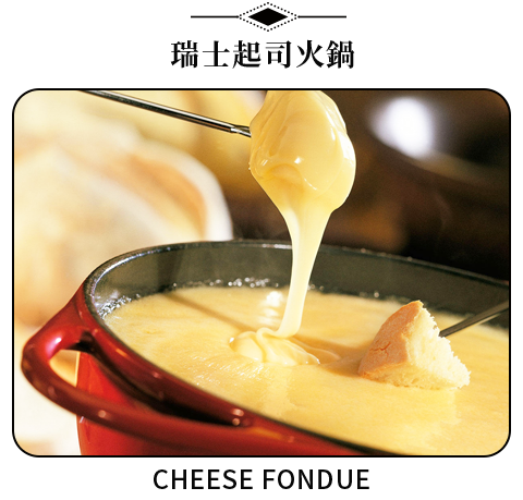 發源於瑞士,有別於一般的中式火鍋。在瑞士,鍋裡倒入白酒及櫻桃酒共煮,再加入數種起司加熱融化,將麵包用長叉沾一口濃郁的起司,在嘴裡散發酒的清香,甚是滿足。