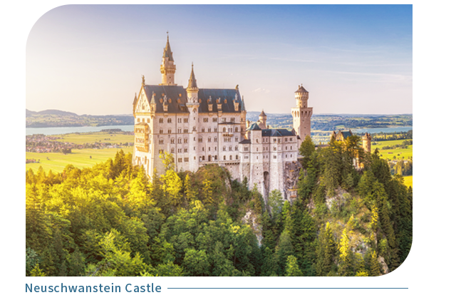 漫步於森林小徑間,彷若國王般抵達天鵝古堡,純白色的大理石建築,隱匿在蒼鬱動人山水之間,聆聽一段動人的故事與傳說,德國浪漫代表莫過於此!