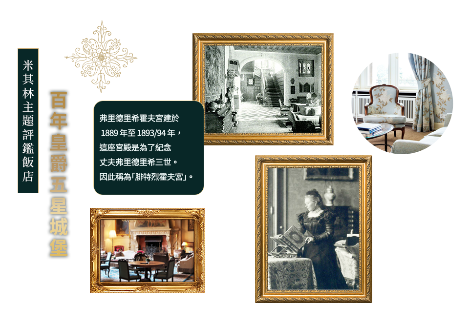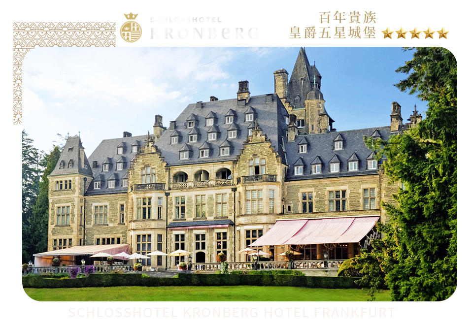 SCHLOSSHOTEL KRONBERG HOTEL FRANKFURT主題飯店是腓特烈霍夫宮(Schloss Friedrichshof ),也是皇家公主維多利亞(Victoria) 的住所,即使經過徹底的翻修,她及其丈夫德皇腓特烈三世(Kaiser Frederick III) 的影響力仍然可見。 如遇飯店客滿或訂不到,則改HILTON FRANKFURT GRAVENBRUCH、LE MERIDIEN FRANKFURT、FRANKFURT MARRIOTTHOTEL、或同級(5★)
