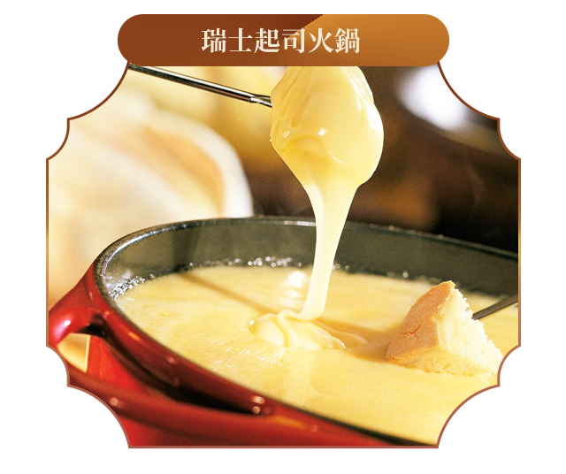 發源於瑞士,有別於一般的中式火鍋。在瑞士,鍋裡倒入白酒共煮,再加入數種起司加熱融化,將麵包用長叉沾一口濃郁的起司,在嘴裡散發酒的清香,甚是滿足。