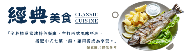 (1)全程於旅館享用美式早餐、午晚餐以中、西式混合使用,以西式為主品嚐地方料理,中式部份安排七菜一湯。 (2)特別選擇當地最具特色且道地的風味餐。