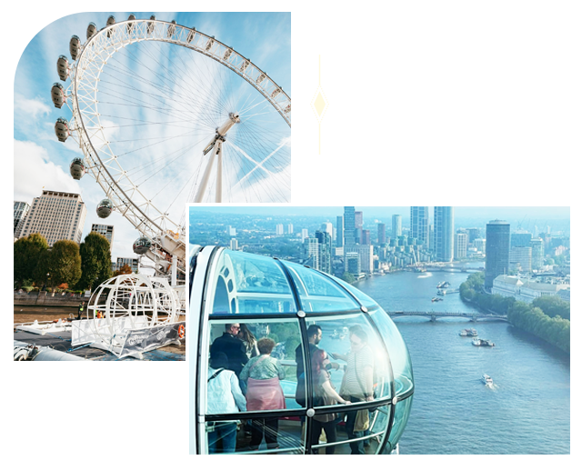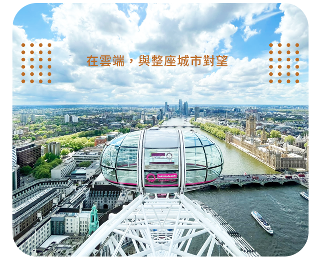 位於倫敦泰晤士河南邊,號稱全世界最巨大的觀景輪,可以在高空眺望倫敦美景,是倫敦最叫人驚豔的千禧地標!「倫敦眼」共有 32 個座艙,每一座艙可帶著 25位乘客在空中作 360 度旋轉,以每次30分鐘的時間,和最寬廣的視野,俯視倫敦眼周圍 25 哩內的美景。從觀景台望出去,倫敦知名地標-塔橋、泰晤士河上的風光一覽無遺。