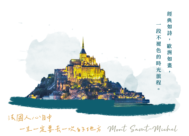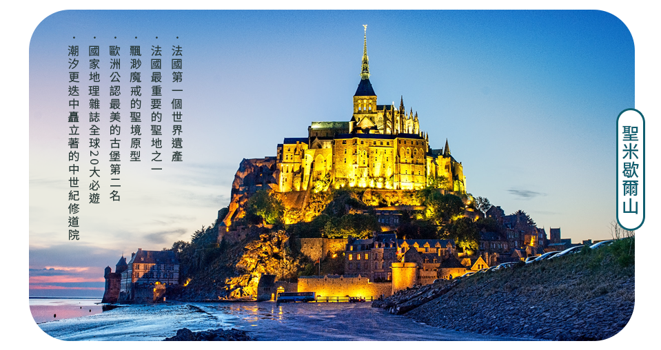 號稱"世界第8大奇蹟"的法國第一勝景—聖米榭爾山,此地是虔誠教徒 朝聖的聖山,也是萬千遊客觀潮的美麗孤島。