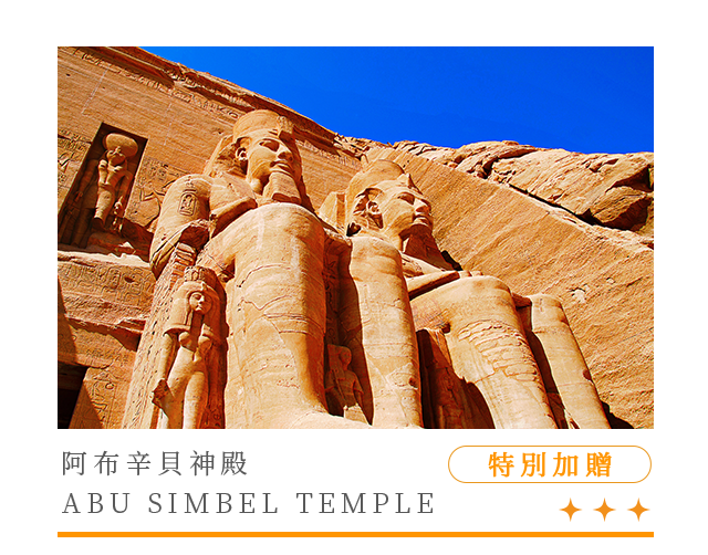 步向拉姆西斯二世的宏偉獻禮,雪花石構築的雙神殿氣勢磅礴。在四座高大雕像的震撼 凝視中,您將見證這座被譽為埃及最美寺廟的永恆光輝。