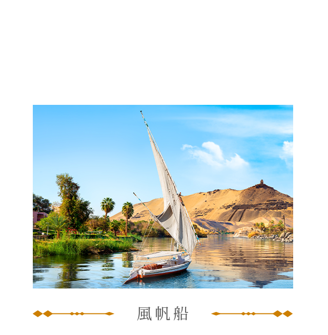 輕傍在尼羅河的水光瀲灩中,潔白風帆承襲著古老航行智慧,於碧色波紋間悠然劃 過;任由風息牽引帆羽,成就這場純粹而動人的水上漂浮幻夢。