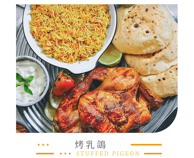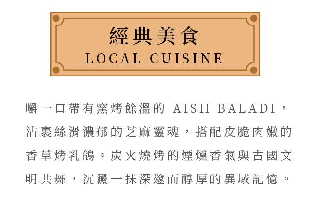 埃及風情環繞在您用餐的四周;各式肉類(B.B.Q)、埃及烤餅、各式各樣埃式調 味醬、當地水果...等等,豐富您的味蕾。