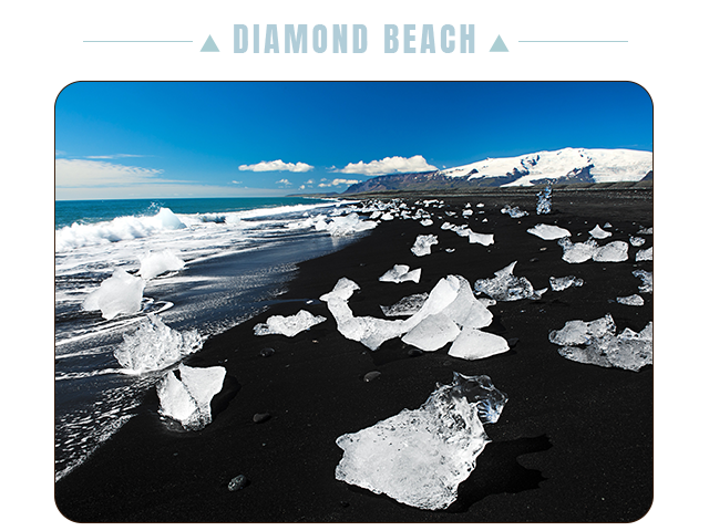 冰河湖漂出的冰塊散落黑沙灘, 晶瑩剔透,彷彿童話世界。