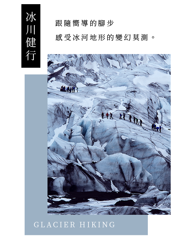 冰川健行是冰島最受歡迎且最具刺激性的戶外 活動之一。踏上千年冰川,近距離 感受冰雪世界的原始力量與美麗。