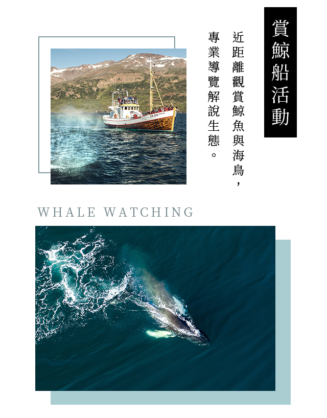 夏季時節,峽灣海水溫暖、餌料豐富, 吸引多種鯨類前來覓食,包括座頭鯨、 小鬚鯨與白喙海豚等。