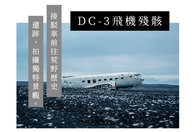 1973年迫降後遺留下的美國海軍DC-3 飛機殘骸。這具孤立於荒涼黑沙上的鋼 鐵殘骸,帶有強烈的末日感與電影場景 氛圍。深受攝影師與旅客喜愛。