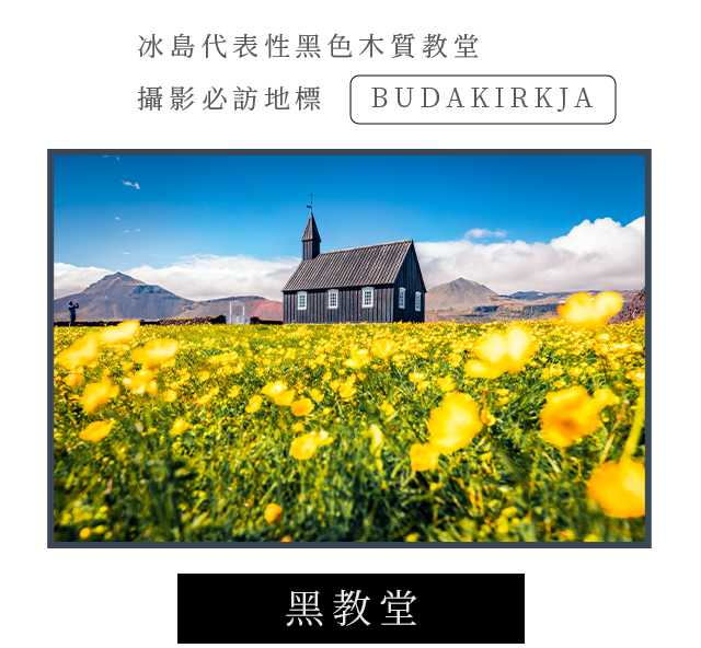 黑教堂建於18世紀,現今的建築於1848年重建。是冰島電影《冰點下的幸福》取景地,孤寂簡約的輪廓在天地間顯得格外動人。