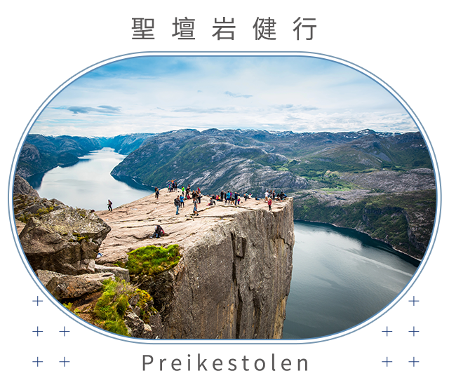 呂瑟峽灣x聖壇岩Preikestolen:特別安排最具人氣及挑戰極限的聖壇岩Preikestolen健行(如不挑戰聖壇岩則可以呂瑟峽灣遊船替代)。