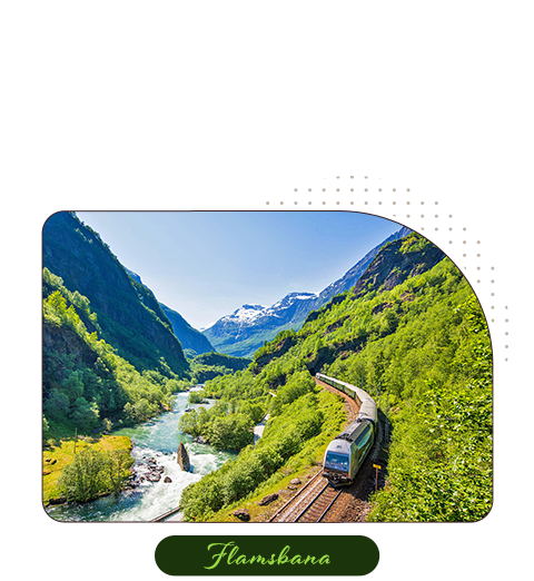 往返米達爾與弗拉姆之間,全長 20 公里,是世界最陡的標準軌距鐵路之一。列車從海拔 866 公尺至僅 2 公尺的弗拉姆,沿途可欣賞白雪覆頂的高山、壯觀的飛濂瀑布與幽谷溪流。這段旅程被譽為挪威縮影,短短一小時,便能飽覽峽灣與山岳的精華景色。