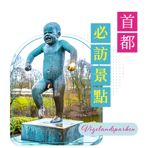 奧斯陸最著名的戶外雕塑公園,園內 212 座雕像以銅、花崗岩與鑄鐵製成,生動描繪人生百態。最受矚目的作品為「憤怒的小孩」,充滿張力與真實感。中央的人生塔高達 17 公尺,由 121 個交織的人體雕塑組成,是園區的象徵地標。