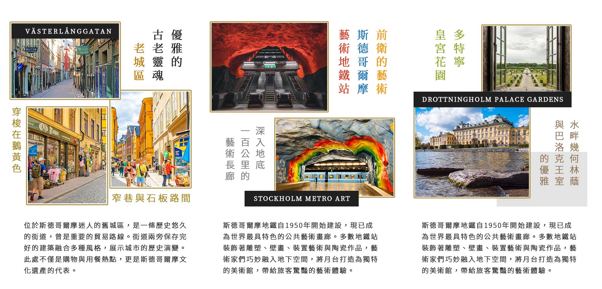 斯德哥爾摩地鐵自1950年開始建設,現已成為世界最具特色的公共藝術畫廊。多數地鐵站裝飾著雕塑、壁畫、裝置藝術與陶瓷作品,藝術家們巧妙融入地下空間,將月台打造為獨特的美術館,帶給旅客驚豔的藝術體驗。
