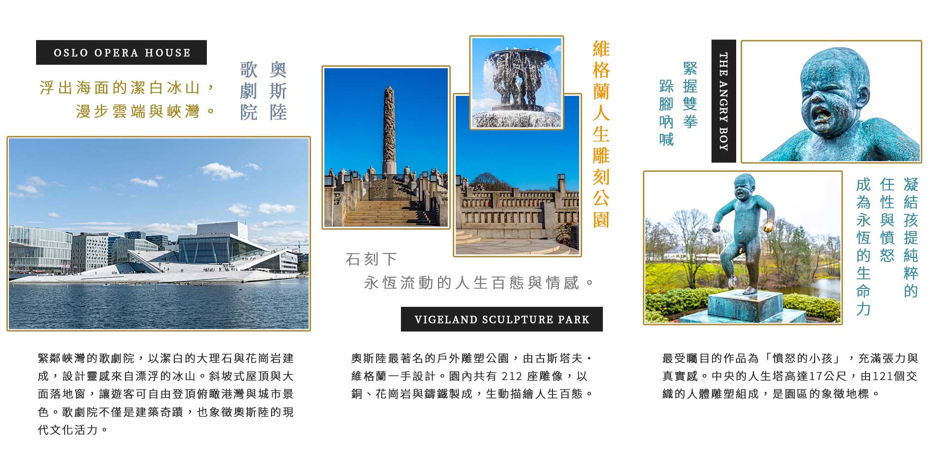 挪威首都奧斯陸,不僅是政治與經濟的核心,也是充滿文化與創意的都市。城市依偎峽灣,周圍綠丘環繞,生活步調悠閒。您可漫步於熱鬧的卡爾·約漢斯大道,參觀國家美術館,欣賞挪威藝術大師作品;或登上造型如冰山的歌劇院屋頂,俯瞰港灣與渡輪,感受海天一色的壯麗。 下