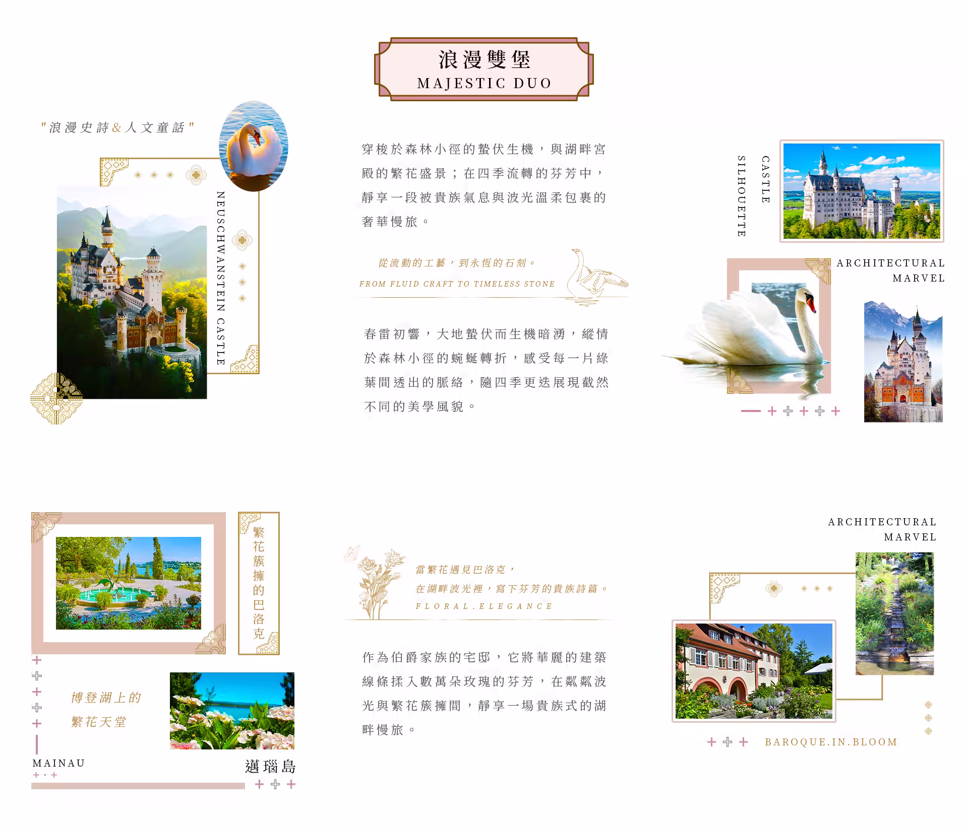 步於森林小徑間,彷若國王般抵達天鵝古堡,純白色的大理石建築,隱匿在蒼鬱動人山水之間,聆聽一段動人的故事與傳說,德國浪漫代表莫過於此!