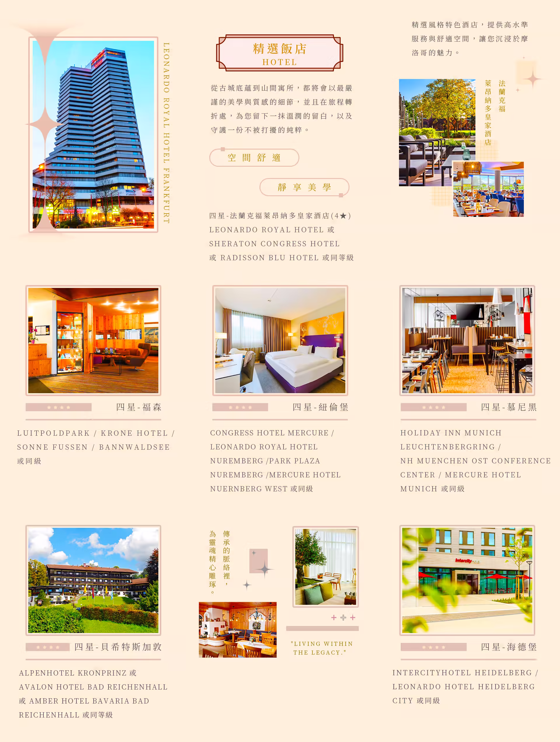 住宿:LEONARDO ROYAL HOTEL 或 SHERATON CONGRESS HOTEL 或 RADISSON BLU HOTEL 或同等級