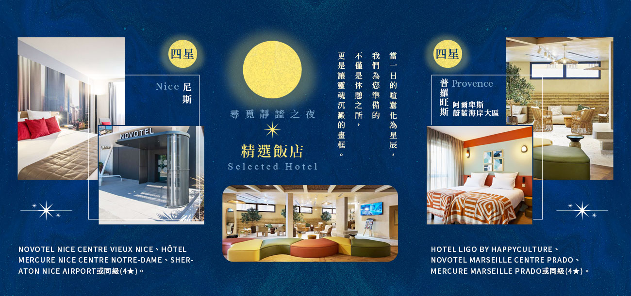 住宿:NOVOTEL NICE CENTRE VIEUX NICE、HÔTEL MERCURE NICE CENTRE NOTRE-DAME、SHERATON NICE AIRPORT或同級(4★)